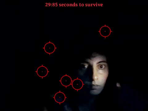 The goal is to escape from the floating particles trying to reach your face. If they manage to do it, they will remove pieces from it. You have to survive for longer than 30 seconds in this unfriendly environment. Moving your face inside the boundaries of the screen, lighting it when your surroundings are safe, and shutting off the light when things become critical.